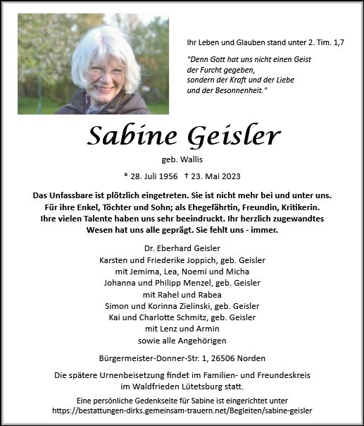 Für den Alltag, der jetzt für Euch, aber besonders für Dich, lieber Eberhard, ganz neu zu begehen und zu bestehen ist, wünschen wir die Kraft und die Stärke unseres himmlischen Vaters, der weiß, was seine Kinder brauchen. Ihr dürft Euch mit Eurem ganzen Sein Ihm anvertrauen und um seine Hilfe und seinen Trost bitten. Auch Sabine wusste um diesen himmlischen Beistand und wir wissen sie nun bei IHM. Das ist der tröstliche Gedanke, der über aller Trauer steht.