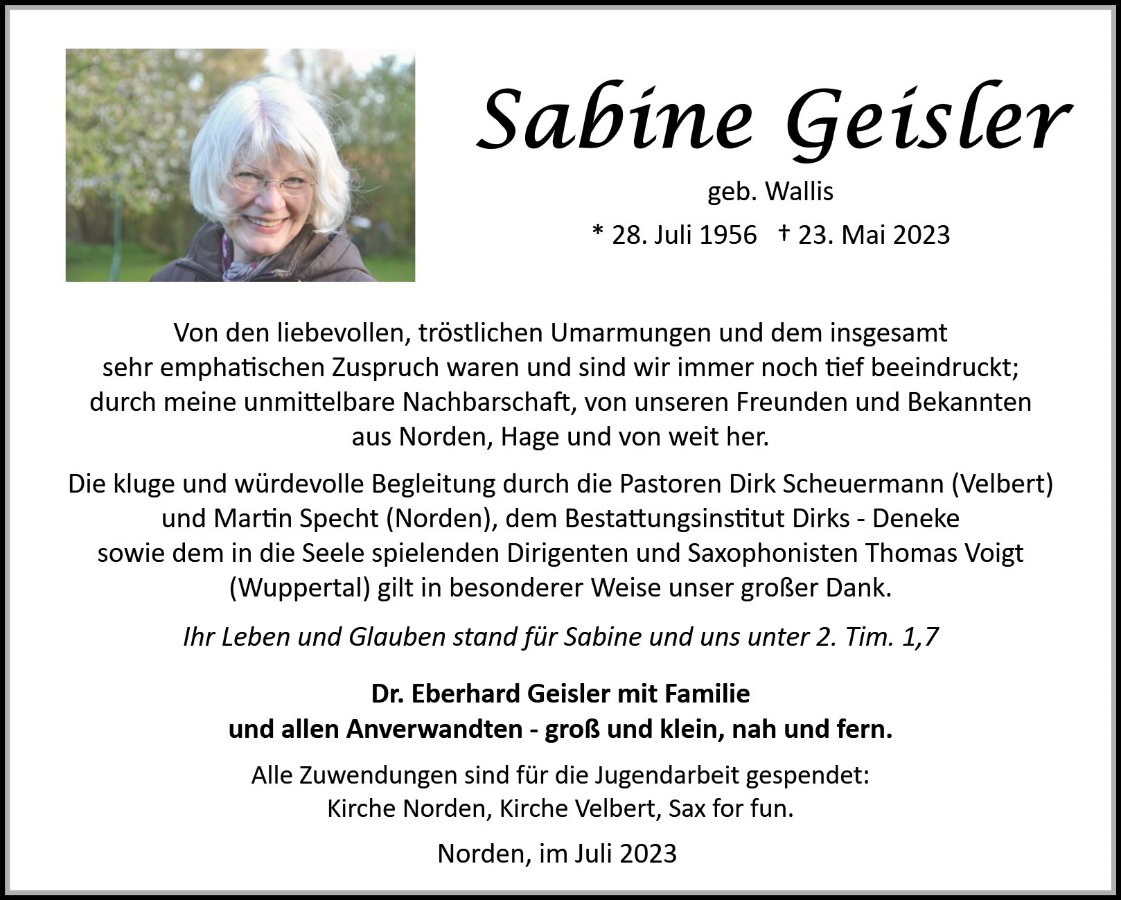 Ich, Ingrid, habe Eure Hochzeit, lieber Eberhard, als erstes Fest, das ich in der Großfamilie Roth erlebt habe, in guter Erinnerung. Und Sabine habe ich als fröhlichen Menschen mit einem Lächeln im Gesicht, wie auf dem Foto in der Traueranzeige, erlebt. Sie hat viele frohmachende Impulse im Leben ihrer Familie und auch anderen Menschen gesetzt. Das wird allen, aber besonders Dir, lieber Eberhard, und den Kindern und Enkeln fehlen.