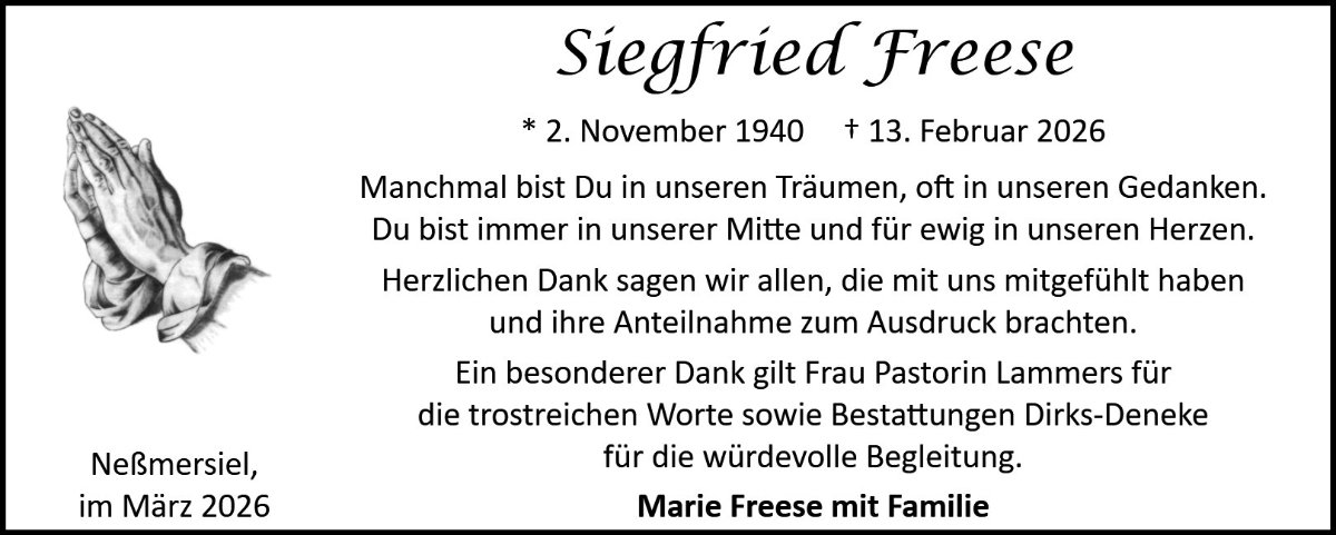 Siegfried haben wir in unserer Kinderzeit als einen guten und freundlichen Nachbarn kennengelernt. Es war immer Zeit für ein kurzes Hallo oder ein ‚Moin‘ und ein kleines, nettes Pläuschchen. Wir werden ihn in guter Erinnerung behalten.
